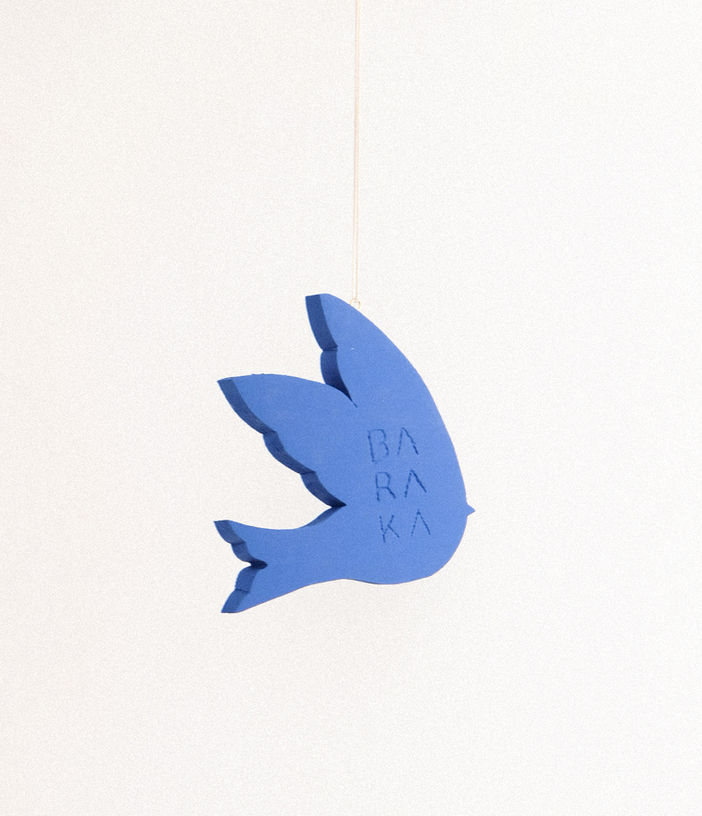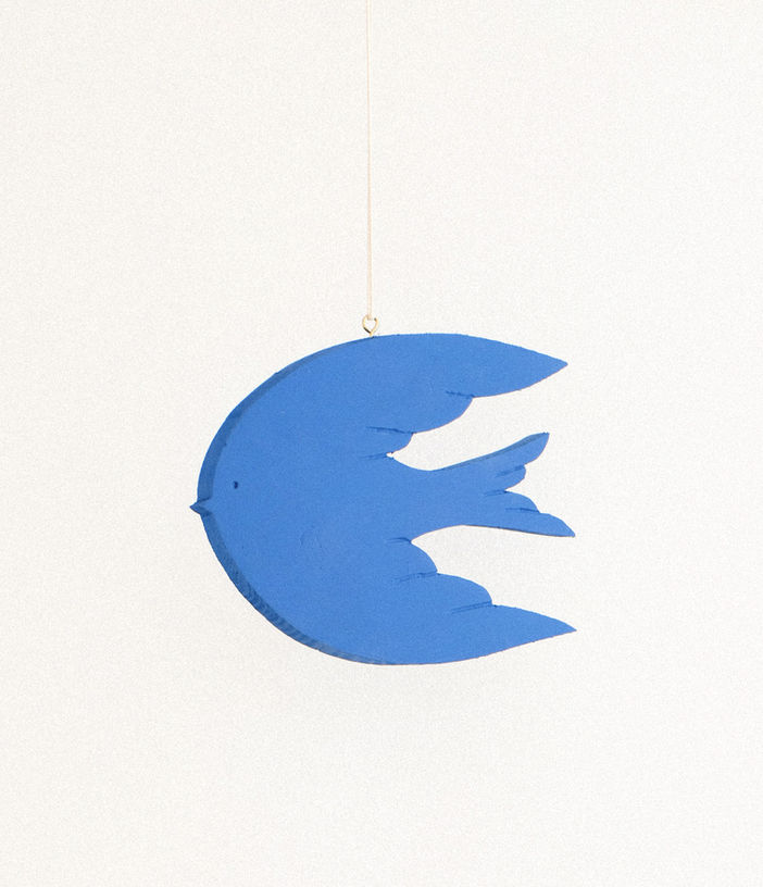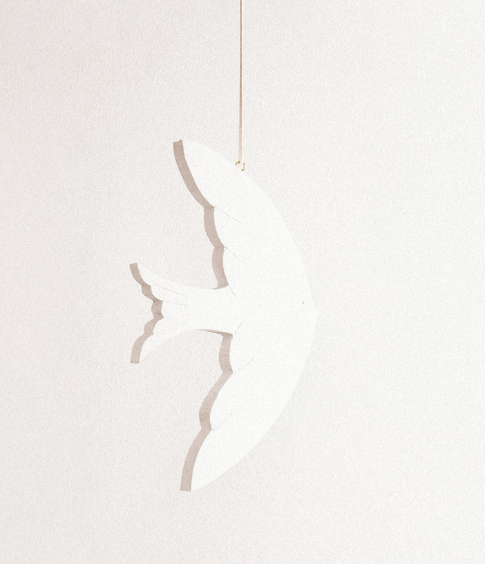EX VOTO est une série de sculptures suspendues, en bois et peint. L'oiseau, symbole ultime de liberté, prends la forme d'objets sacrés suspendus.
