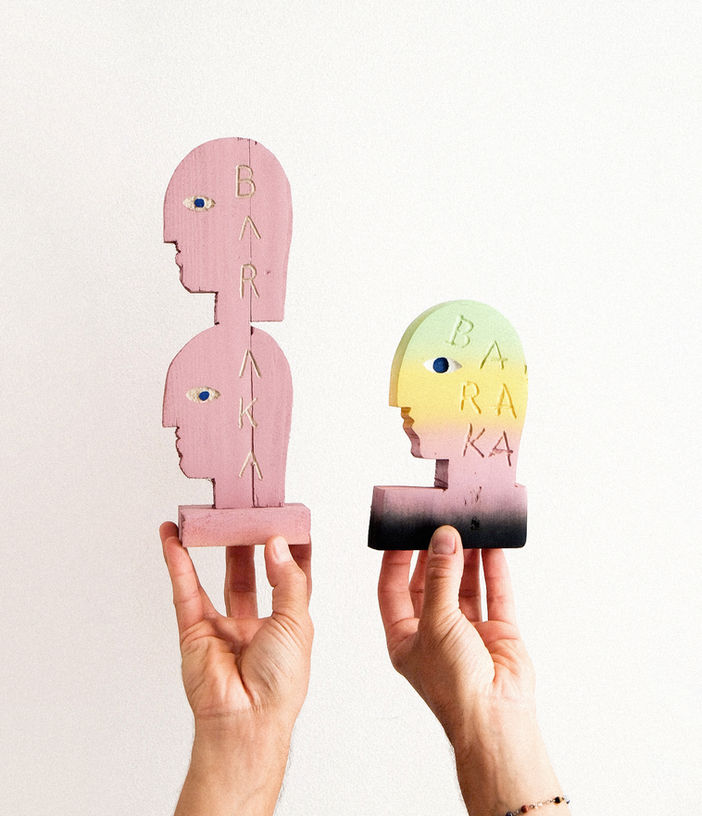 La série AMULET est une exploration des symboliques de porte-chance, de porte bonheurs, d'objets protecteurs. Les symboles prennent alors forme d'objets en bois peint.