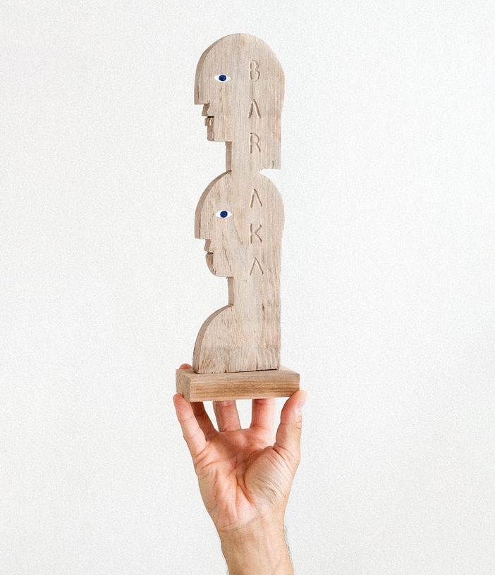 Série de sculptures porte-bonheur, en bois upcyclé et peint. Symbole de collectif, de famille, de l'union des pensées créatrices et de la force du groupe, les totems adoptent la forme d'un empilement de têtes humaines.